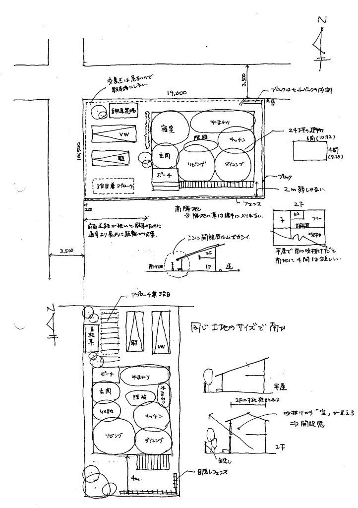 この落書きはある検討地で建物を計画すると実は想像している暮らしが難しいということをお伝えするために書いたメモです。